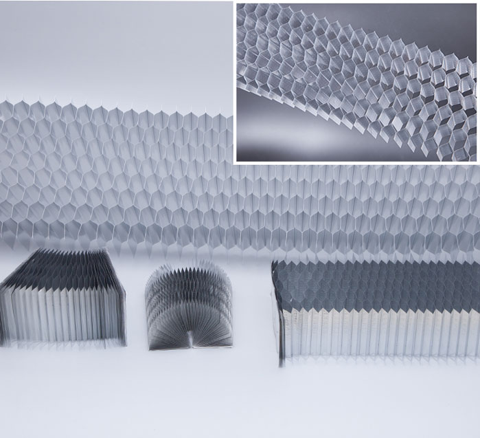 鋁蜂窩芯是由多層鋁箔粘合,疊壓,然后拉伸展開成規則的六邊形蜂窩芯子。鋁蜂窩芯具有尖銳、清晰的孔壁、沒有毛刺,適合高質量的芯對面材的粘接及其他用途。蜂窩板芯層為六邊形鋁蜂窩結構,相互牽制的密集蜂窩有如許多小工字梁,可分散承擔來自面板方向的壓力,使板受力均勻,保證了面板在較大面積時仍能保持很高的平整度。